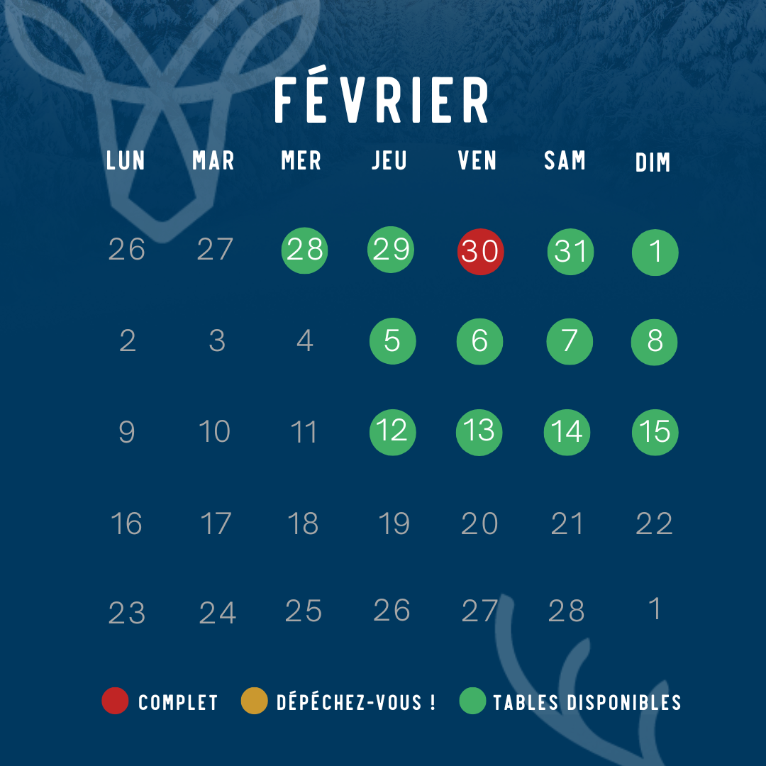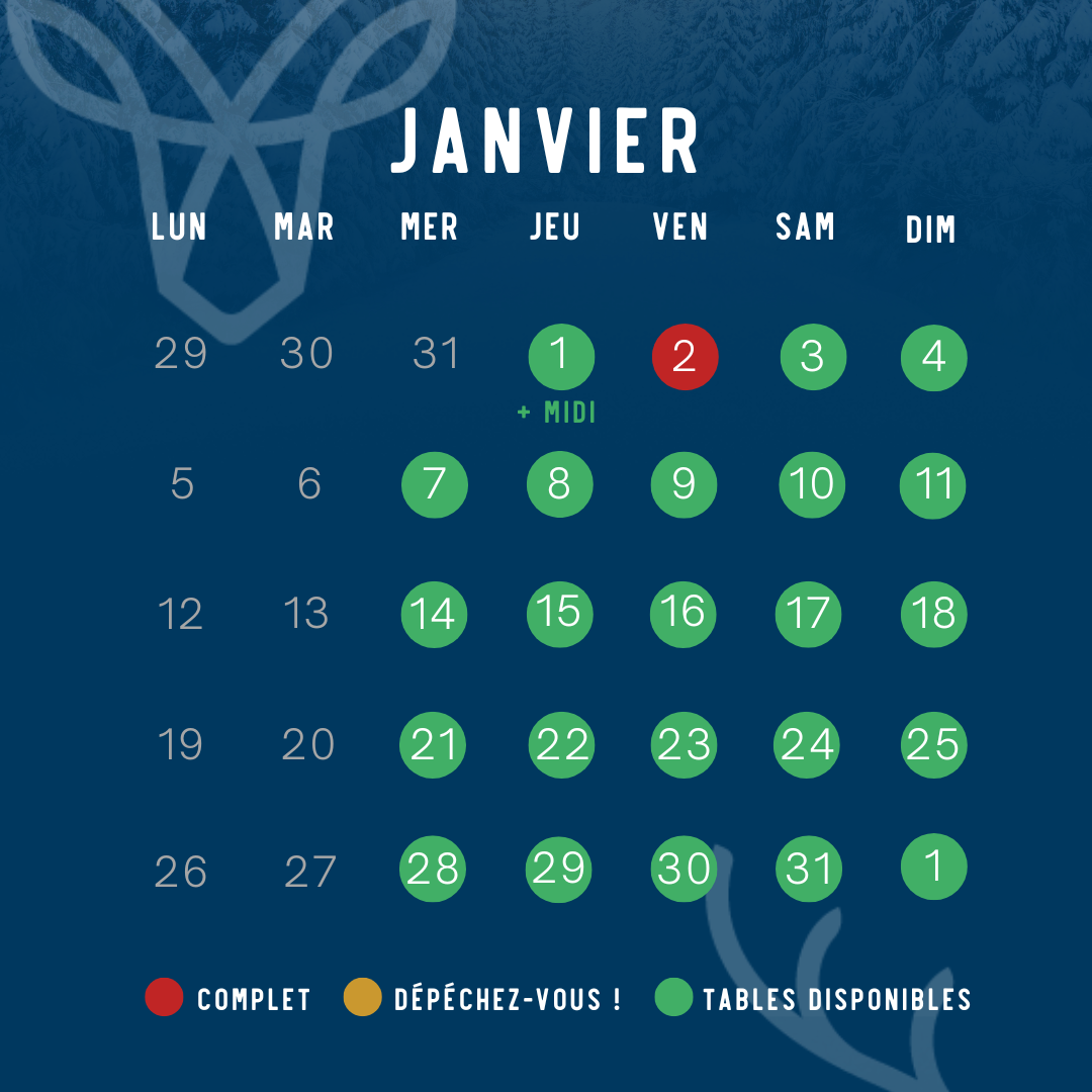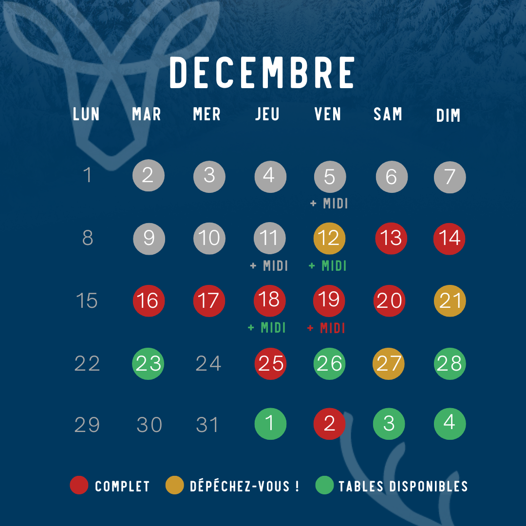 Prochaines dates : 14/12, 21/12, jeudi 25/12, 28/12, 04/01, 11/01, 18/01, 25/01, 01/02, 08/02 et 15/02.
