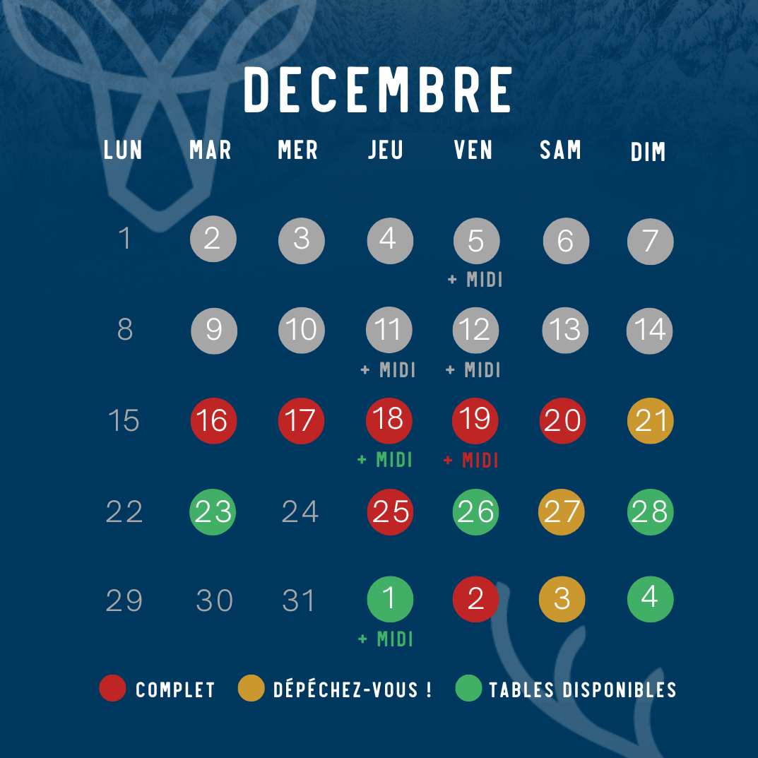Prochaines dates : 14/12, 21/12, jeudi 25/12, 28/12, 04/01, 11/01, 18/01, 25/01, 01/02, 08/02 et 15/02.